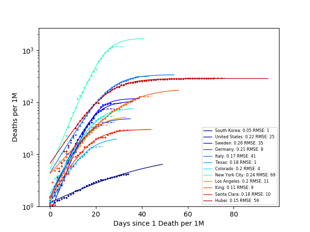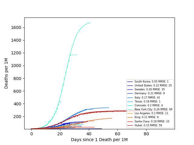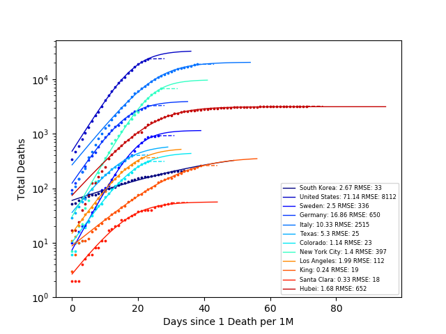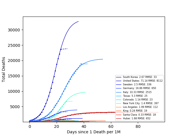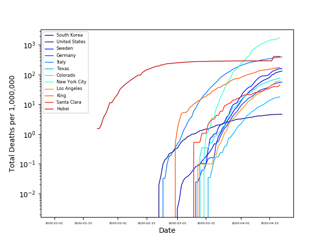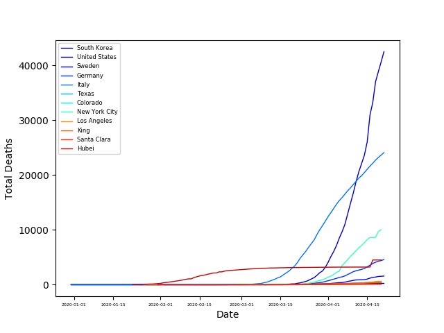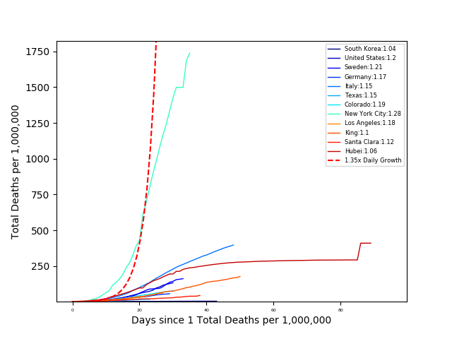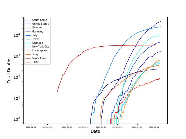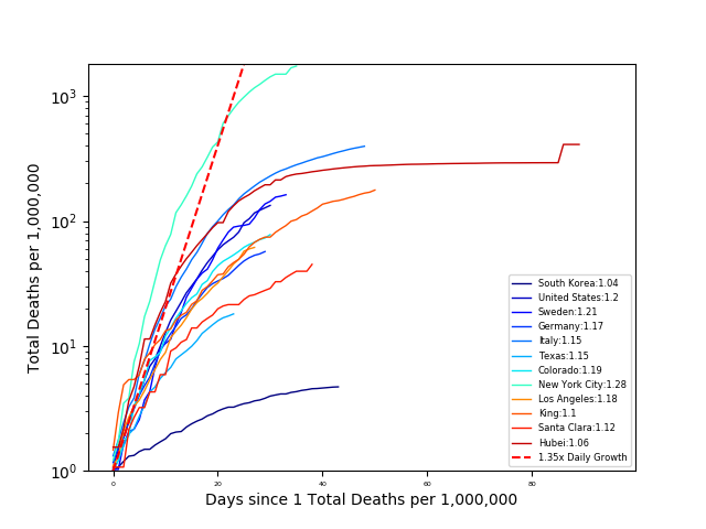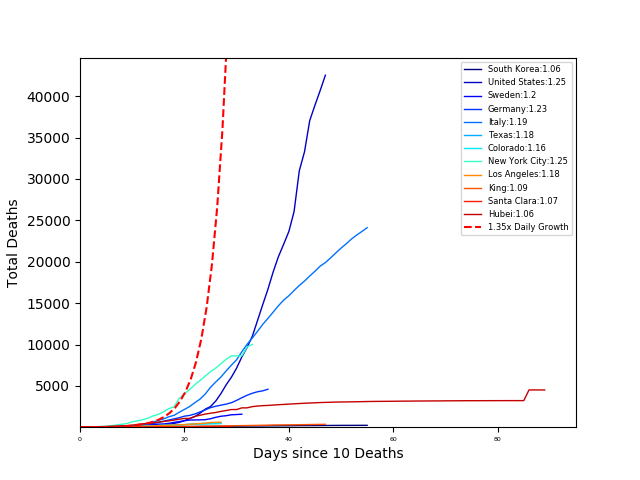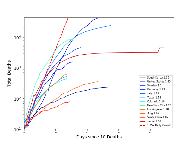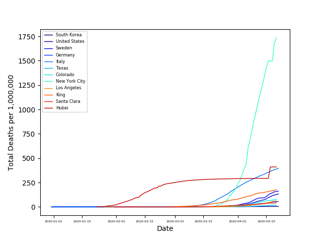 From the GIF we can see that the death rate is increasing most rapidly per outbreak day in New York, Louisana, and Southwest Georgia. Also, we see that South Korea has contained the outbreak the most effectively with a growth rate of 1.05, while the US has the largest growth rate (comparing only countries), at 1.2. Idealistically, if the US ‘flattened the curve,’ matching South Korea’s growth rate many lives would be saved. In Los Angeles County about ~1,500 lives would be saved.