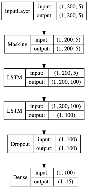 Based on these hyperparameter studies, I chose to use two layers with 100 neurons each and a final dropout layer of 0.01, as shown in this diagram. Note: masking was applied as the input sequences had varying lengths and this is effectively a seq2seq network.